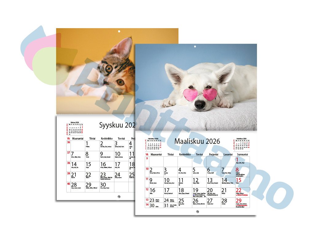Minimitilausmäärä 10 kpl. Huomioithan että tässä kalenterimallissa on sivuja myös kalenteriosion jälkeen.